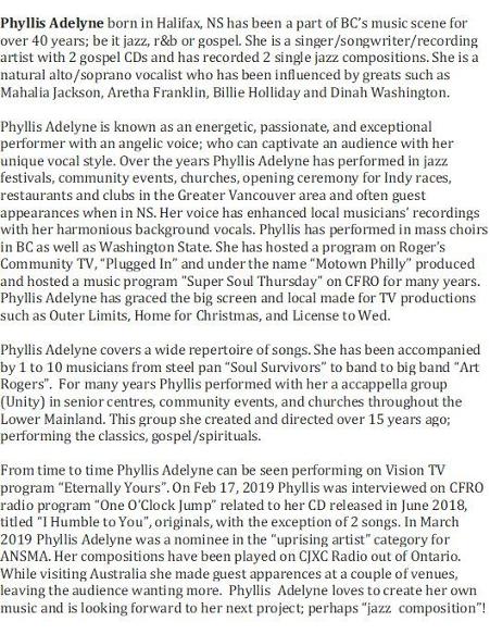 BC's Jazz, Gospel, Soulful Singer/Songwriter, Recording Artist